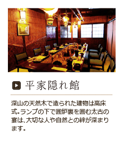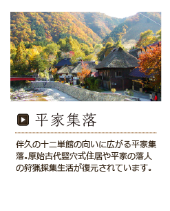 その昔、京に栄華を誇った平家は、源平の戦いに敗れ、源氏の厳しい追手から逃れて、秘境湯西川に身を隠して生活をはじめました。こうした落人達の生きざまや生活様式は、多くの秘話・伝説に満ちています。それらを後世に永く保存継承する拠点として、復元されたのが平家の里です。