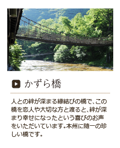 人との絆が深まるといわれる縁結びの橋で、この橋を恋人や大切な方と渡ると、絆が深まり幸せになったという喜びのお声をたくさんいただいています。本州に随一の珍しい橋です。