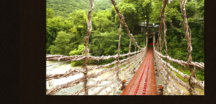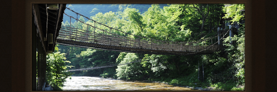 湯西川をはさんで、本館と食事処を結ぶかずら橋。この橋は、平家が落ちのびる際、追手を防ぐために切り落とされたという逸話があります。