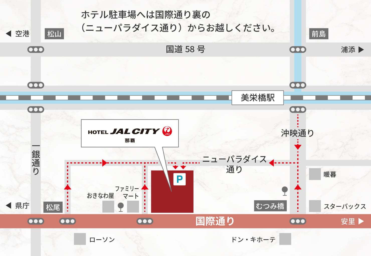駐車場の入り口はホテル裏になります。目的時に【「流求茶館」〒900-0013 沖縄県那覇市牧志1丁目3-17 TEL.098-862-3031】を設定していただきますと、駐車場入口近くまでのルートが表示されます。