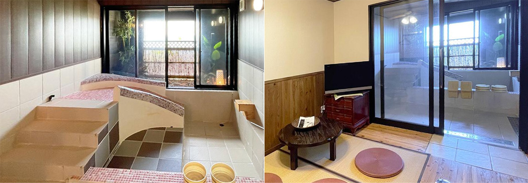 和室のお部屋です。滑り台がついた貸切風呂で小さなお子様連れのお客様に人気な「かぐや姫」。