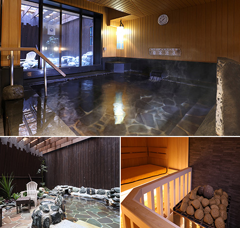 - 当館の天然温泉は自家源泉であり、体を温める効果が大きく、血液の循環を良くし筋肉をやわらげる効能がございます。
