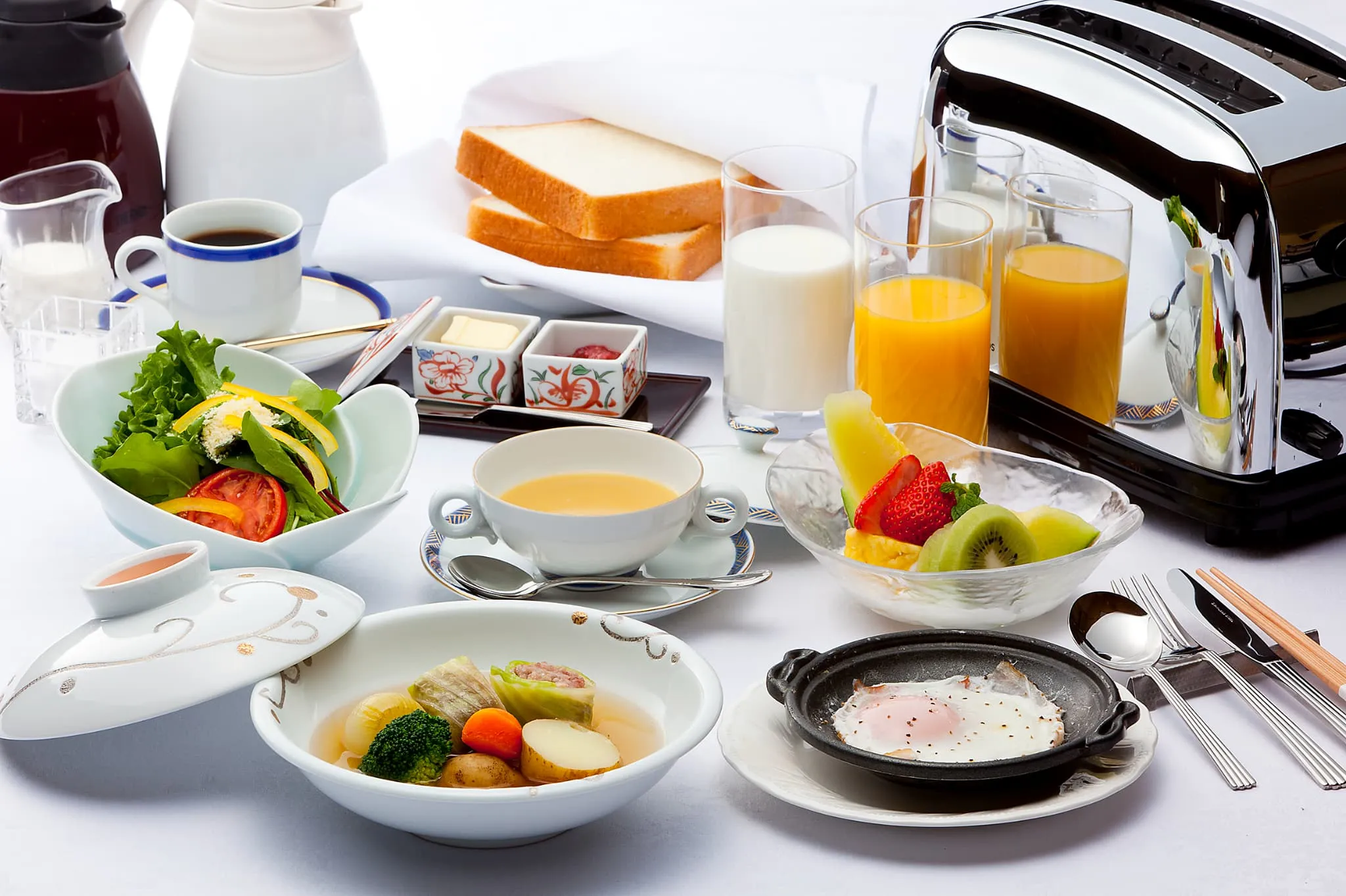 ご朝食では、お米を白御飯又は三種類の御粥から、焼き魚は三種類から、