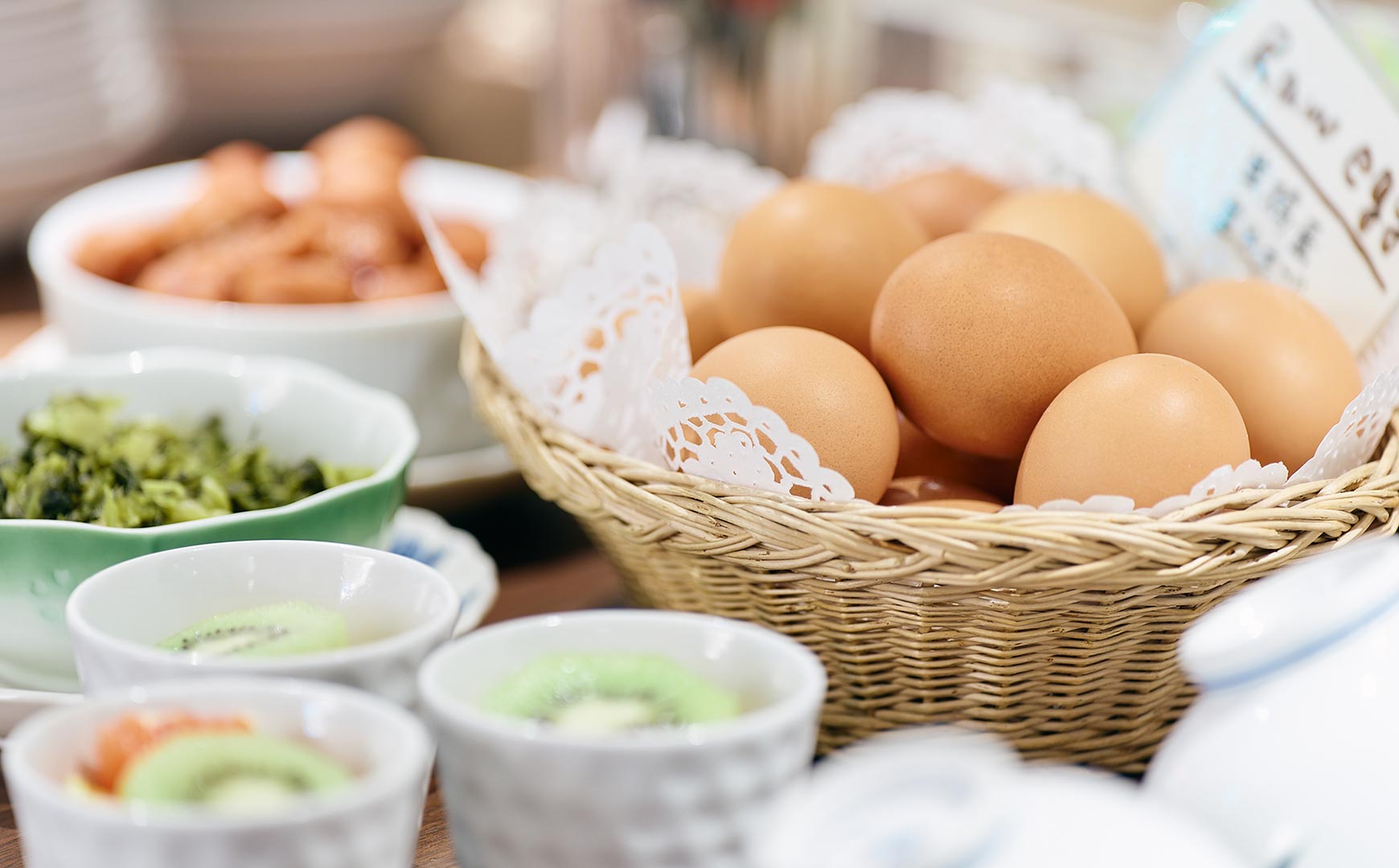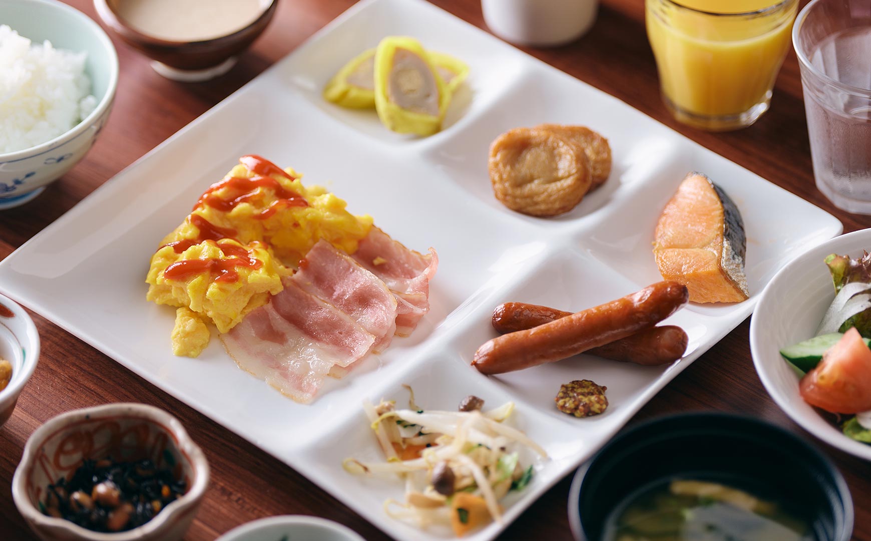 熊本の郷土の食材を使った和洋のバイキング。熊本はお野菜・お米・お水と豊かな自然の中で育まれた沢山の美味しい食べ物がございます。季節の食材を使った手作りの朝食が、皆様の一日の活力となりますように。