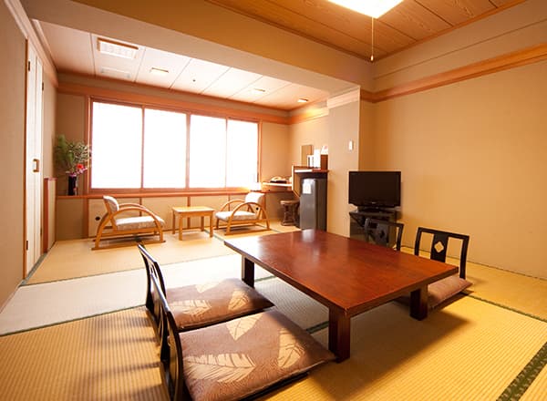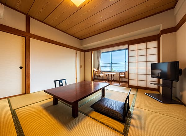 バス、トイレ付きの和室18.5㎡です。湯けむり情緒あふれる別府鉄輪の街並みを眺めながらお過ごし下さい。