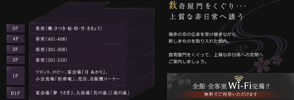 | (特別室:6室、次の間付き:5室、和洋室:1室、坪庭付き:2室、 標準客室:10室、ユニバーサルデザインルーム:1室、その他:2室) |
