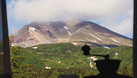 お部屋の窓からは、標高2,291mの旭岳を眺めることができます。刻々と変わる山の姿は、ずっと眺めていても興味がつきません。