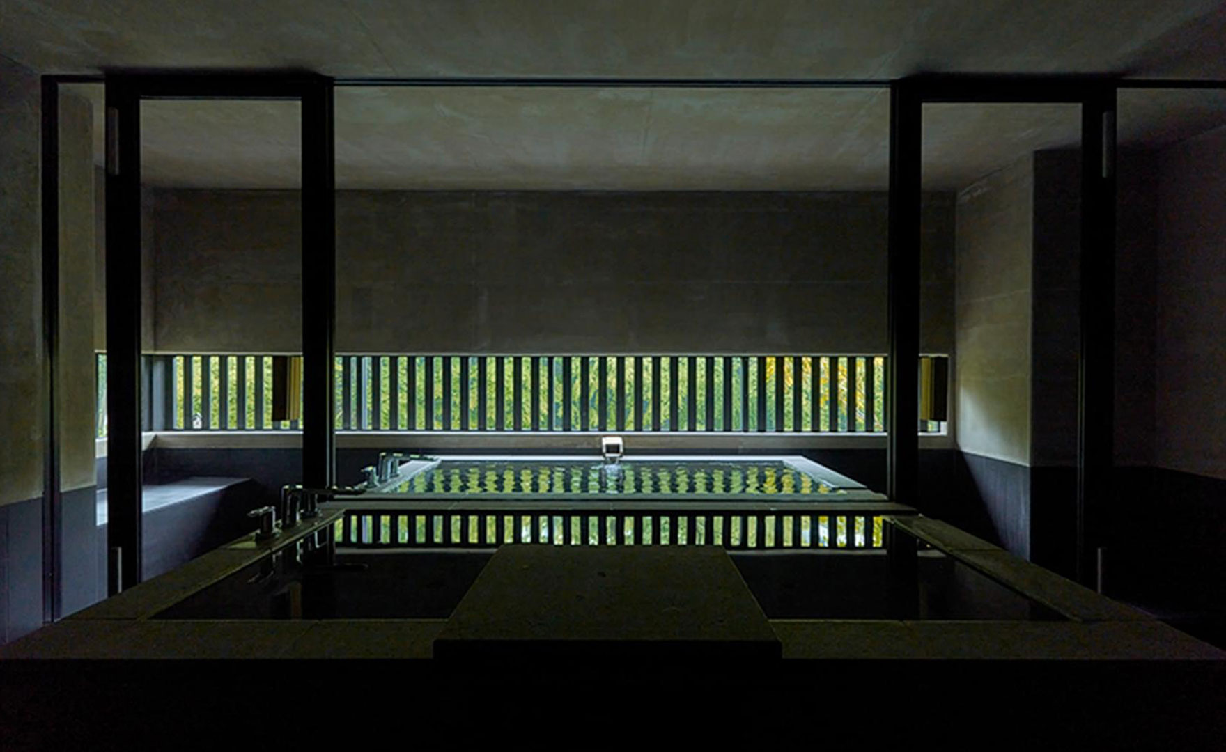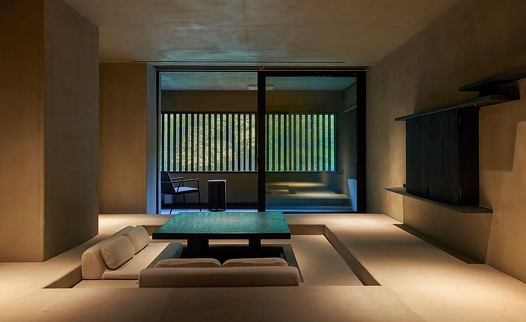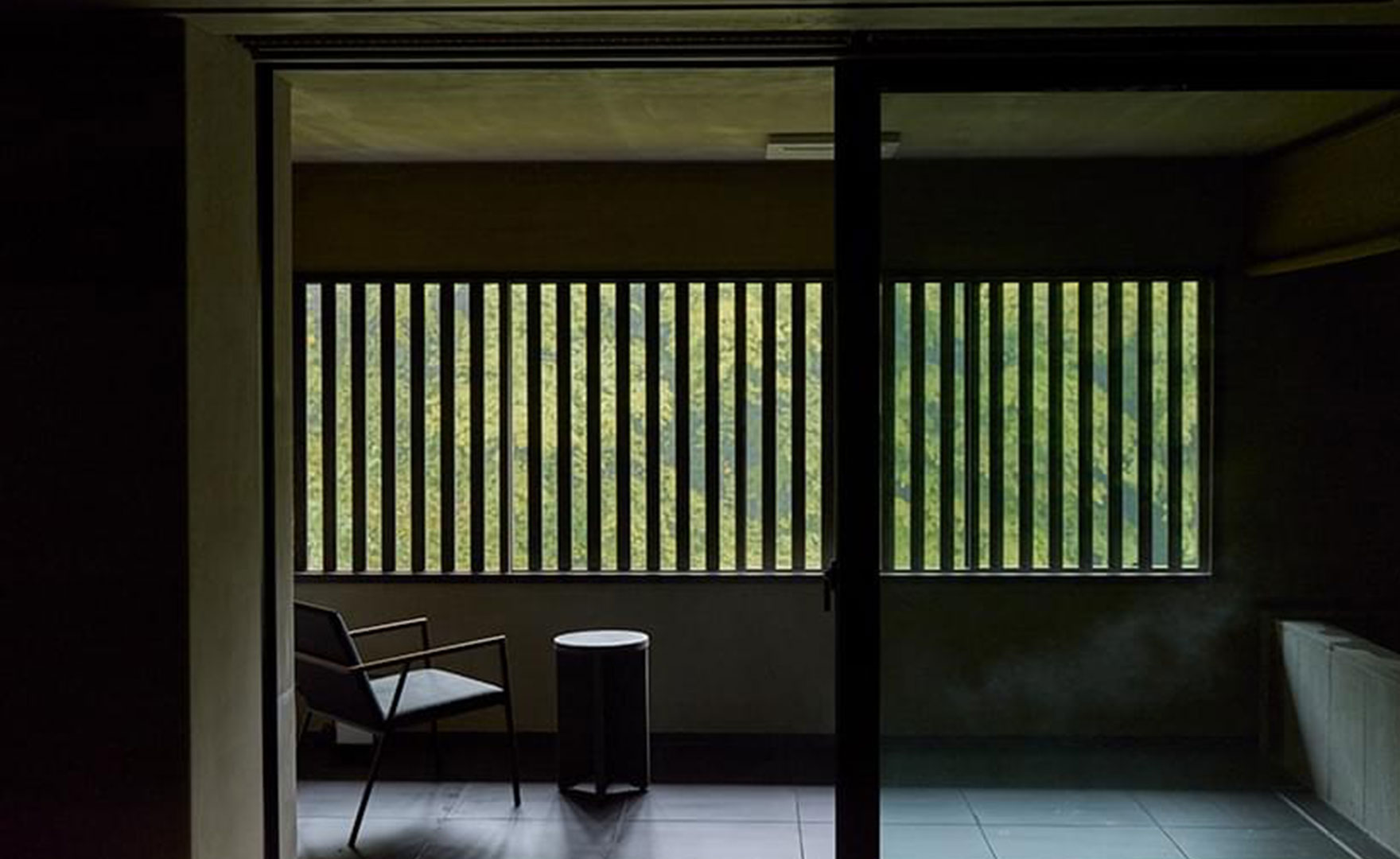 日本古来の建築美を、現代の視点で再構築したジュニアスイート。陰影礼賛とした静寂な空間と、備え付けの温泉が洗練された癒しのひとときを作り出します。