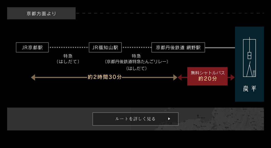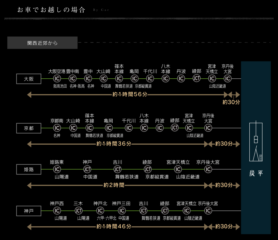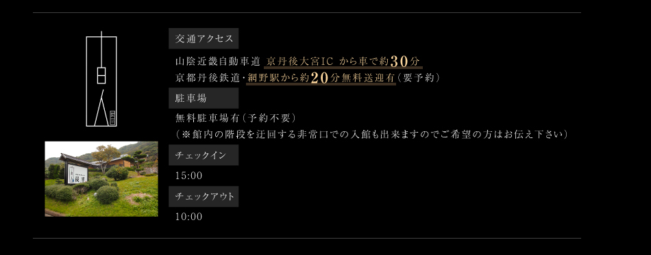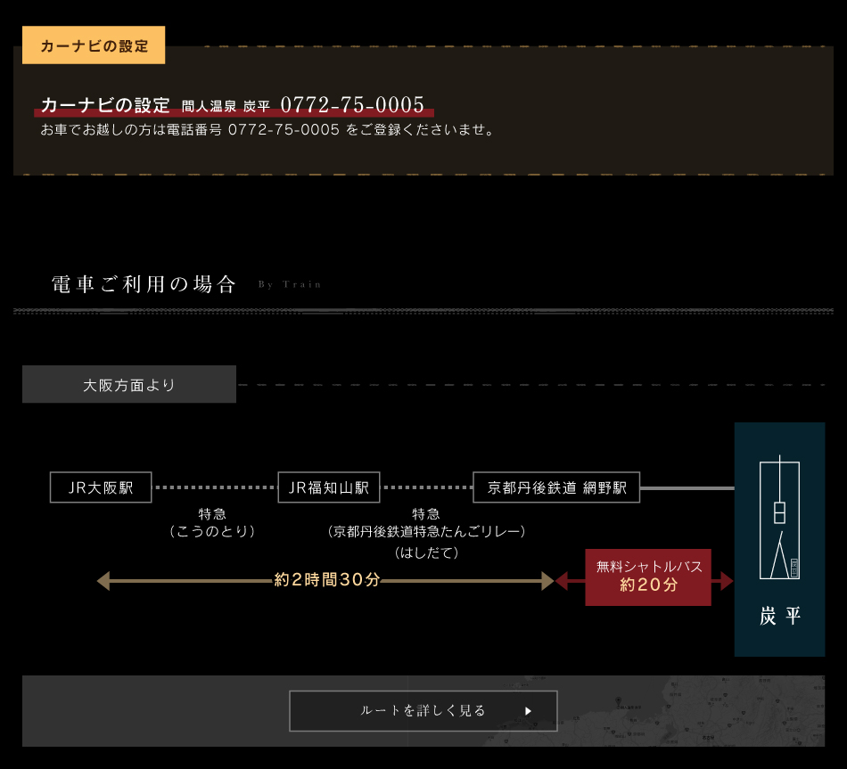 窓に広がる夕日と海 美食を奏で150有余年 間人温泉 炭平 ■交通アクセス