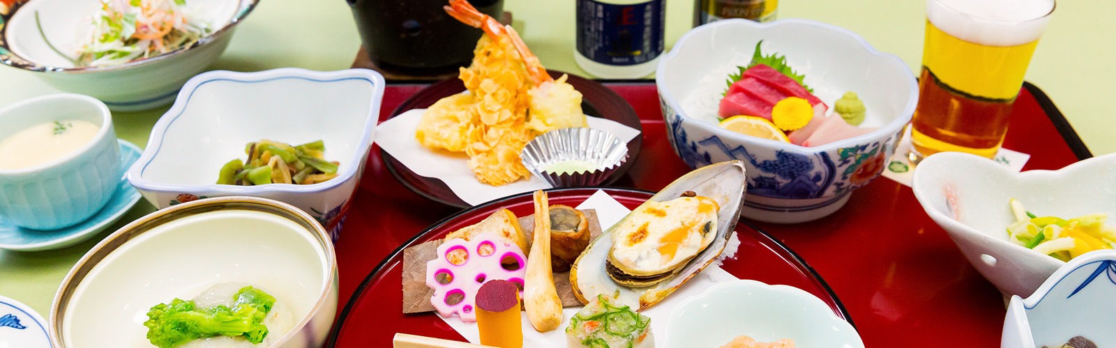 ご夕食は“季節の旬の食材”が中心の和食膳をご用意しております。創業より受け継がれてきた伝統のおもてなしをご堪能ください。