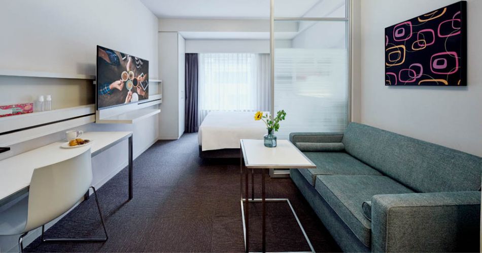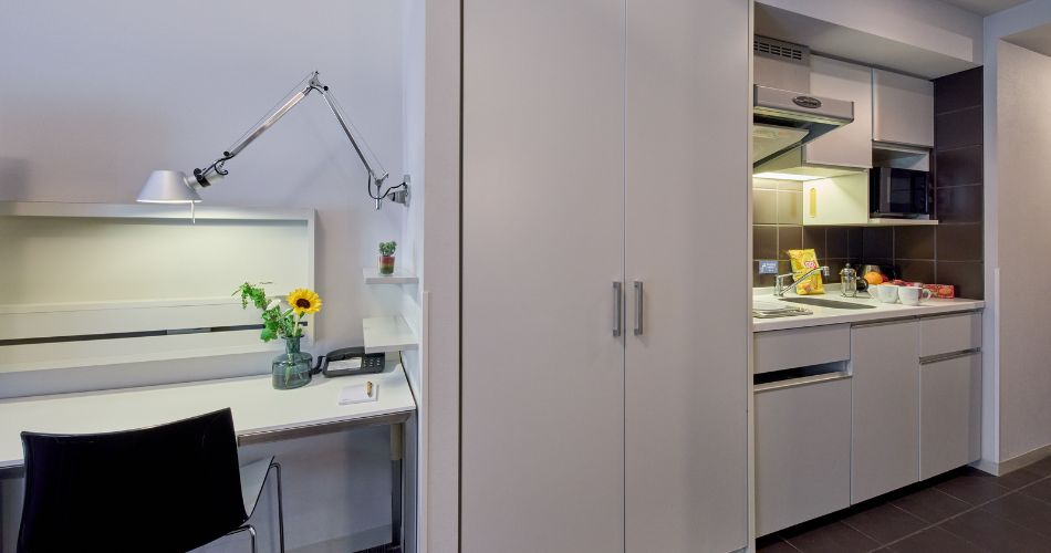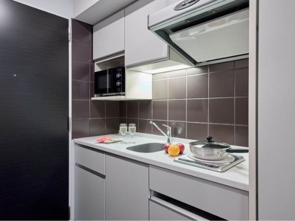 客室にはフルサイズのキッチンを完備しており、調理器具、食器やカトラリーも揃えております。電子レンジ、ワンボックス冷蔵庫も備えているので、温めなおして食事が出来とても便利です。ホテルの利便性とアパートのプライベート感覚が融合された、短期、長期のご滞在にも用途に合わせご利用いただけます。