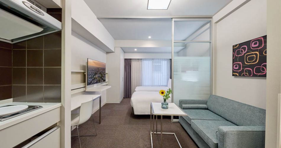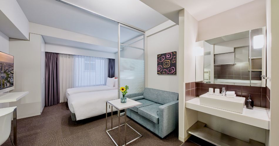 | 説明 | 28㎡のスタジオエグゼクティブツインには、スリーピングエリアにツインシングルベッドがあり、床から天井までの大きな窓がアパートメントを広々と感じさせます。1人または2人のゲストに最適な広さですが、3人目のゲストにはソファベッドを設置することもできます。 各部屋には、ワークステーション、環境に優しいバスアメニティ付きの専用バスルーム、液晶テレビ、個別に調節可能なエアコンとヒーターが備わっています。 |