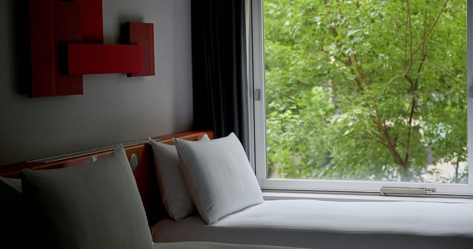 全室25平米以上のゆったりとした広さのお部屋にはシンプルでモダンな家具が揃えられ、大きな窓からの明るい陽射しが一層広々と感じさせます。スライドドアのあるお部屋では、ベッドルームとリビングの間仕切りができ、昼と夜との使い分が可能です。