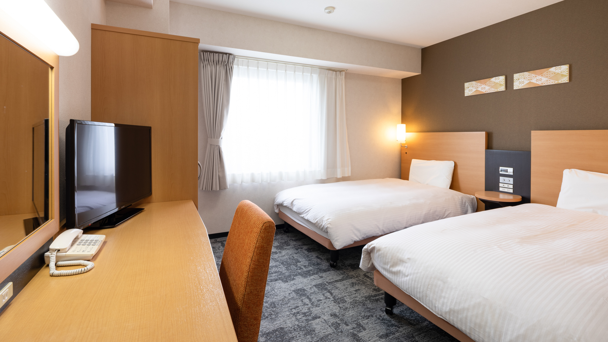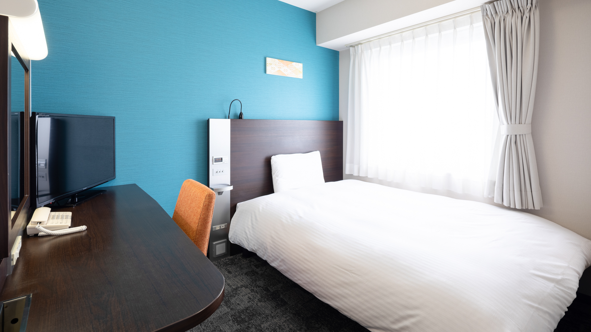 枕元にはコンセント&USB完備、広々デスクでビジネス利用にも最適です。快眠枕「チョイスピロー」を