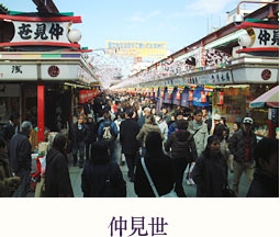 浅草寺の門前町として発展した日本で最も古い商店街の一つ。雷門から浅草寺 本堂までの間に多くの店が立ち並ぶ。