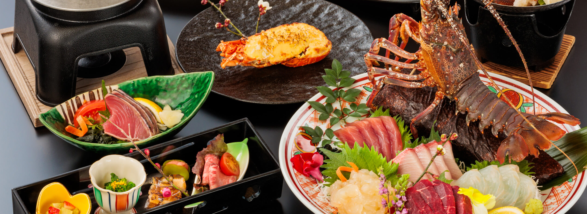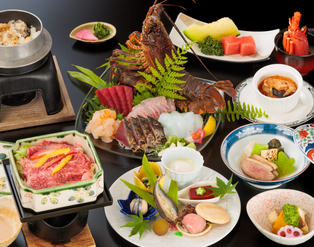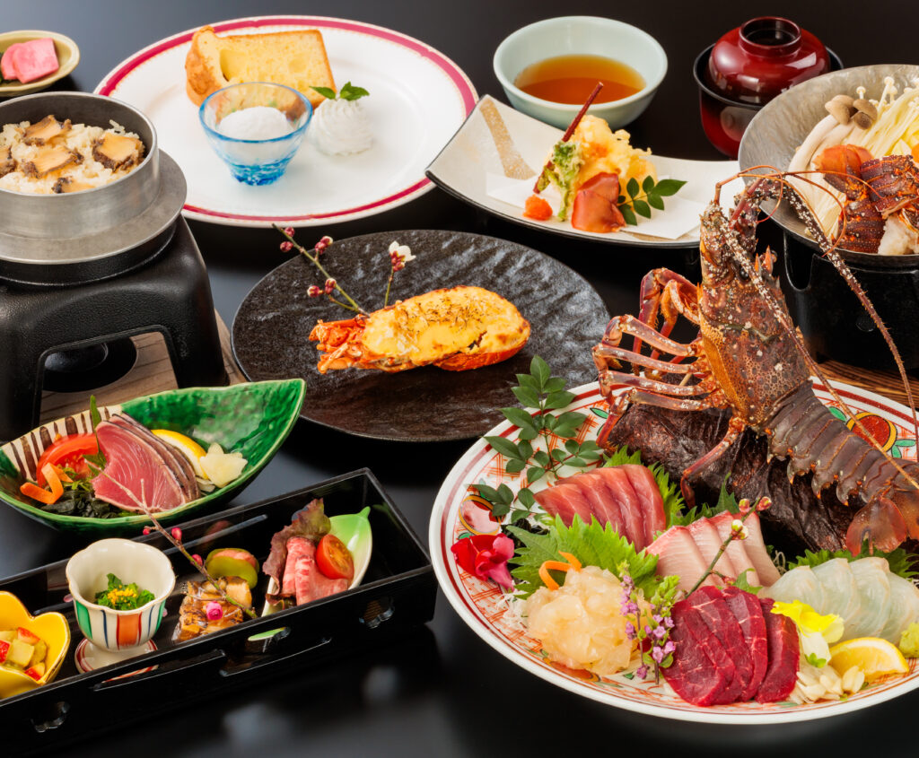 地元でとれた伊勢海老に、日戻り鰹の藁焼きやうつぼ、地元の野菜などを用い、美味しい料理をご提供します。
