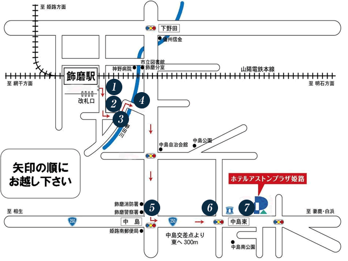 暫く歩き、消防署を通り過ぎると飾磨警察署があります。ここの交差点(中島交差点)を左へ曲がって下さい。 |