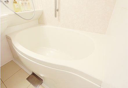 全室通常の浴槽より丸みを帯びた楕円形の浴槽です。アメニティコーナーの入浴剤を入れて心地よいバスタイムを。