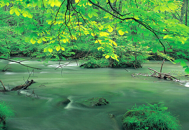 十和田湖から流れ出る全長約14.5キロにわたる渓流の景勝地。新緑や紅葉など四季折々の自然と、水の流れの美しさ、滝などのスポット散策が人気です。