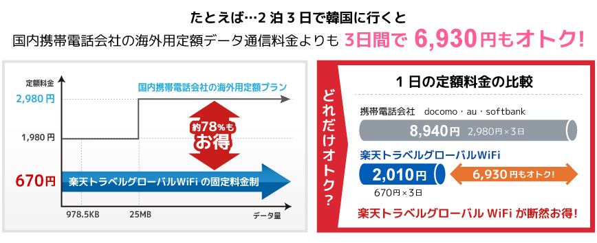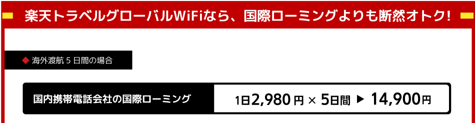 ※上記の料金例はキャンペーン適用価格です。 WEB申込期限内に申し込むと最安値の「海外旅行・出張応援キャンペーン」及び「その他周遊キャンペーン」の価格が自動適用され、WEB申込期限を過ぎますと定価(1日あたり+200円)になりますのでご注意ください。WEB申込期限は受取方法によって、異なります。詳細はこちら»