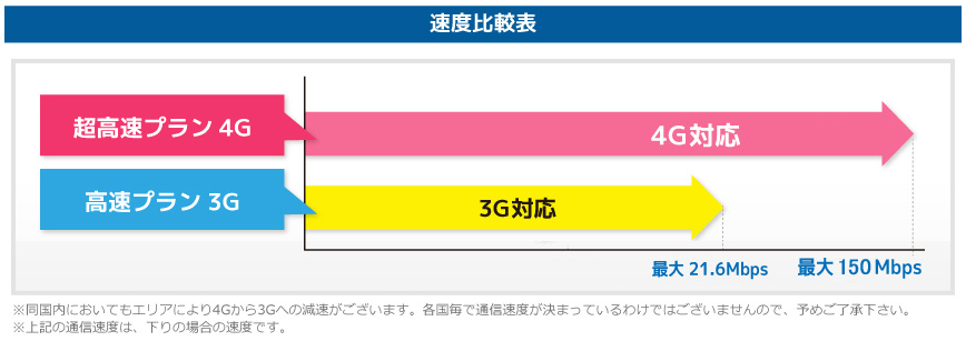 ※ベストエフォート方式のため、回線の混雑状況や通信環境などにより通信速度が低下または通信できなくなる場合があります。3Gプランは、3G・3.5G通信規格での提供となります。