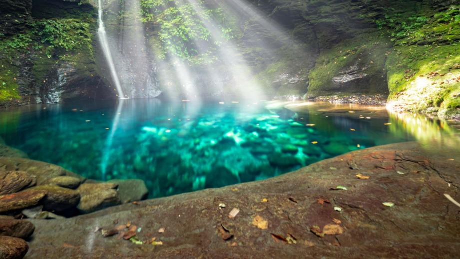 条件によって滝壺が異なる青色に見える「おしらじの滝」。滝までは、山道を歩くので、ちょっとしたハイキングも楽しめます。沢の水が少なく、滝が流れていないことも多いようですが、青く輝く神秘的な滝壺を見ることができます。