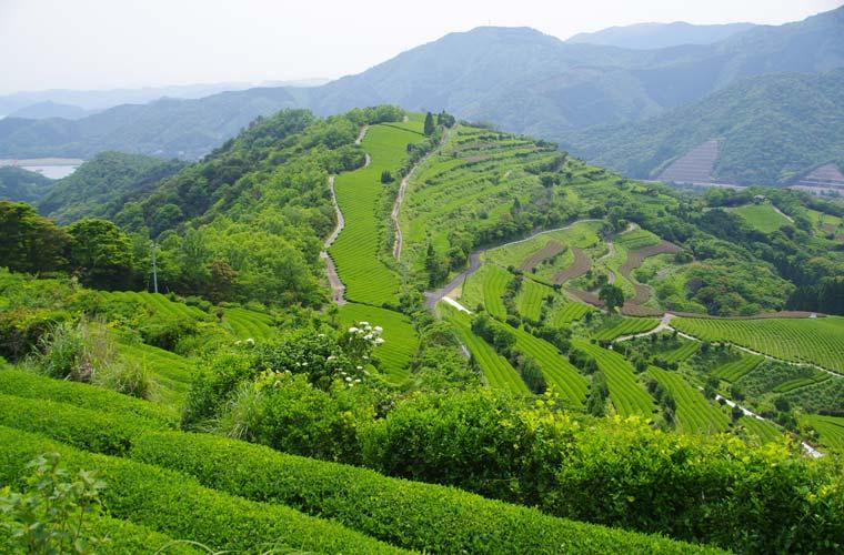 地下(じげ)にある茶山は「日本の里100選」のひとつで、新茶の緑色と遠くに望む青い海のコントラストが魅力ポイント。天気によっては四国まで見ることができます。茶畑には「さえみどり」「さきみどり」などが栽培されています。