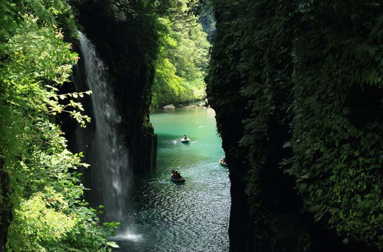 溶岩の浸食による奇岩や柱状節理の断崖がおよそ7kmにわたって続く高千穂峡。そのシンボル的存在となっている「真名井の滝」から水が水面に落ちる姿は圧巻。遊歩道から見る景色も良いですが、貸しボートから見上げる滝も迫力満点でおすすめです。
