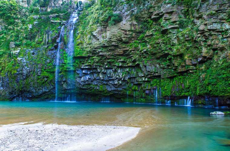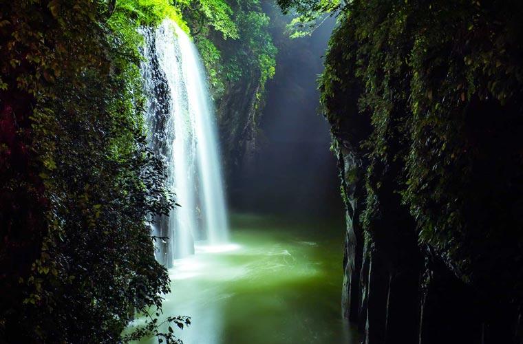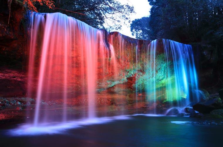 落差は約10mと小さいながら約20mの幅があり、落ちる水がカーテンのように見える滝です。木漏れ日が照らすと神秘的で美しい風景に。滝の裏からも観賞できる珍しいスポットです。時期によってはライトアップも行われ、昼間とは違うカラフルなライトに照らされた滝の姿を見ることができます。