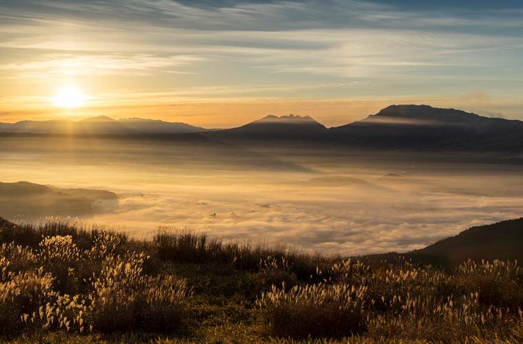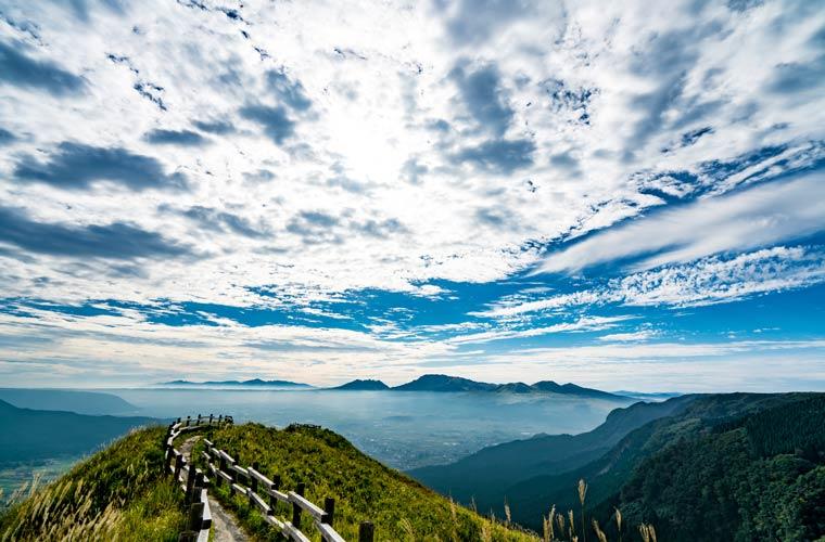 熊本県阿蘇市にある「大観峰(だいかんぼう)」は、標高935.9mと阿蘇北外輪山の最高峰。熊本出身の文豪・徳富蘇峰により名づけられました。その名の通り、山頂からは阿蘇の街並みや阿蘇カルデラ、阿蘇五岳、九重連山までが一望でき、360度の大パノラマが楽しめます。秋から冬にかけての晴れた早朝には、眼下に広がる雲海を見られることも。アクセス良好で駐車場も整備されています。