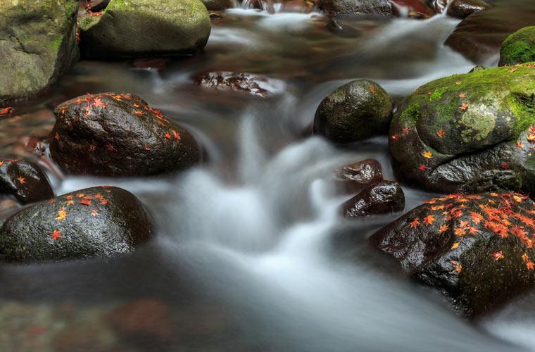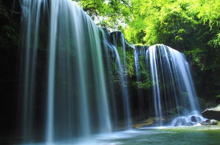 「阿蘇くじゅう国立公園」の一角である「菊池渓谷」は、標高500〜800mの憩いの森。うっそうとした広葉樹林を縫って流れる渓流は、阿蘇の外輪山から湧き出した伏流水で、日本名水百選にも選ばれています。春の新緑や夏の清流、秋の紅葉に加えて、冬には幻想的な樹氷も。四季を通じて写真好きな人や観光客が訪れる人気のスポットです。