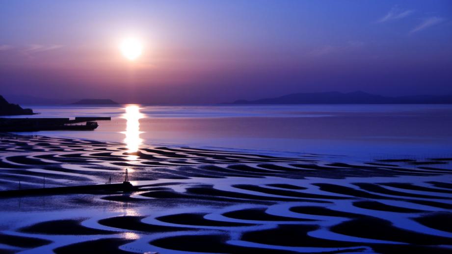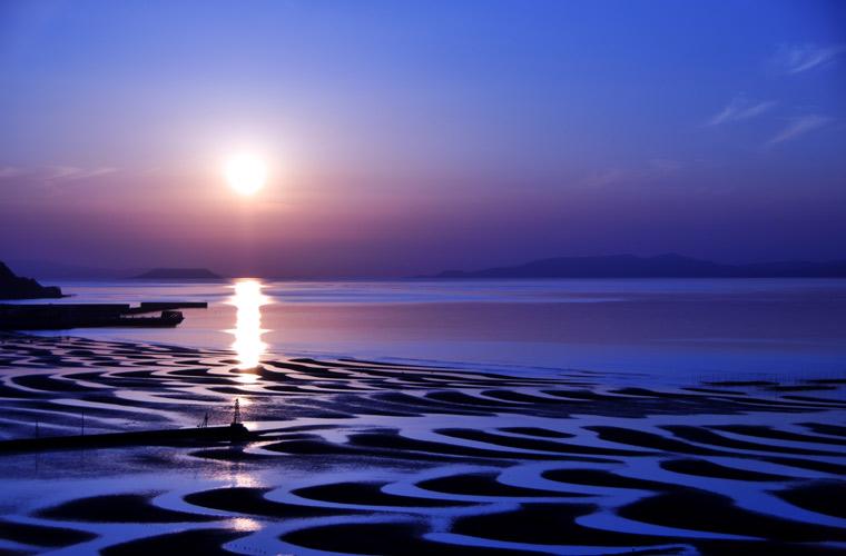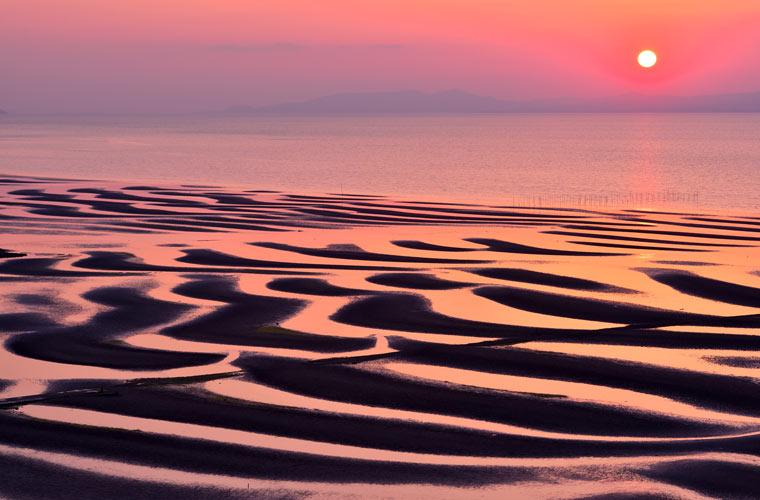 「日本の渚百選」「日本の夕日百選」に選定されている御輿来海岸(おこしきかいがん)。景行天皇が訪れた際、御輿を駐め見入られたという伝説があり、それが名前の由来だと言われています。潮が引いた海岸に美しい曲線美の砂紋が現れ、夕焼けの色によって異なる眺めは見る価値あり。