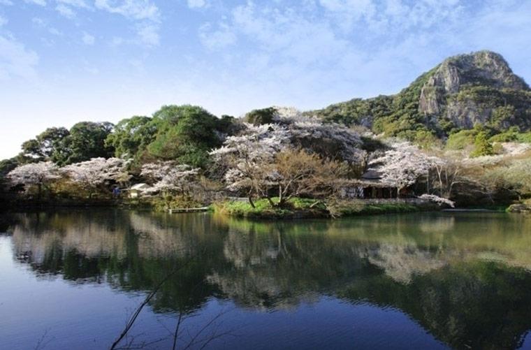 鹿児島県伊佐市の「曽木(そぎ)の滝」は、滝幅210m、高さ12mの壮大なスケールから「東洋のナイアガラ」とも称されるダイナミックな瀑布。奇岩がそそり立つ滝を中心に自然公園として整備されており、桜や紅葉の季節にはイベントも開催されています。園内には縁結びの神として名高い「清水神社」もあり、デートスポットとしても人気です。
