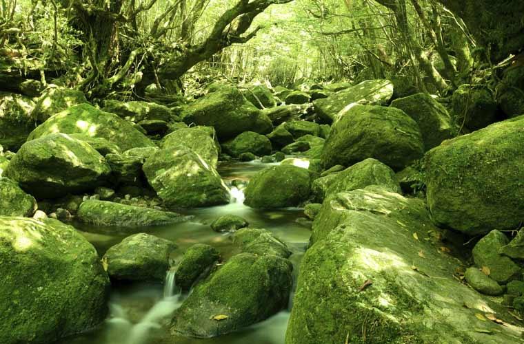 屋久島は日本初の世界自然遺産登録エリアで、九州最高峰の宮之浦岳(標高約1,936m)をはじめ1,000m超の山々が46座もあり、「洋上のアルプス」と呼ばれています。自然の魅力が詰まったエリアですが、その中でもおすすめは白谷雲水峡。大岩や清流が織りなす清々しい渓谷と苔の絨毯に覆われた森がみごと。遊歩道が整備されていて、屋久杉やツガ、モミなどを見ながら散策できます。