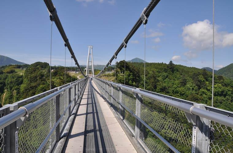 日本の滝百選にも選ばれた、震動の滝・雄滝や雌滝を望む九重“夢”大吊橋。長さ390m、高さ173m、幅1.5mの橋は、歩道専用として日本一の高さを誇る吊り橋です。四季折々の大自然を360度の絶景パノラマで堪能できます。