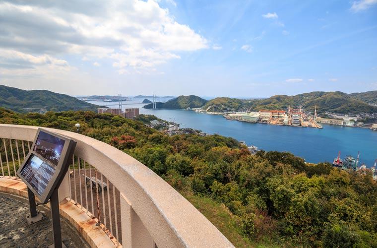 「西海国立公園」に指定され、日本一島が密集しているエリアともされる「九十九島(くじゅうくしま)」を、180度のパノラマで眺められるのが「展海望(てんかいぼう)」。佐世保港と九十九島海域を隔てる俵が裏半島中央部に位置し、展望台からは複雑に入り組んだリアス式海岸と大小200を超える島が織りなす美しい光景と、佐世保港の風景を一度に楽しめます。