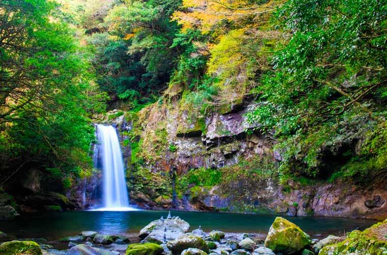 エメラルドグリーンの滝壺が神秘的な雄川(おがわ)の滝。駐車場から滝壺まで遊歩道があり、自然を身近に感じられる自然スポットです。