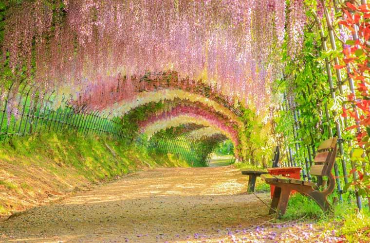 4月下旬~5月中旬には22種類の藤が咲き乱れ、大藤棚や藤トンネルは見ごたえあり。11月下旬には約700本の紅葉を見ることもでき、春と秋と2回訪れたいスポット。