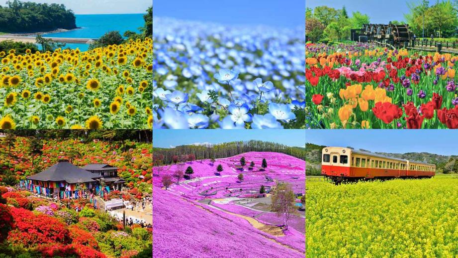 面白山高原コスモスベルグ 周辺の宿菜の花畑の中を走る「小湊鉄道」や「いすみ鉄道」をはじめ、芝桜、ネモフィラ、藤の人気スポットが揃う関東エリア。また、温泉地としても知られる那須高原のチューリップ畑や鎌倉のあじさいも魅力です。