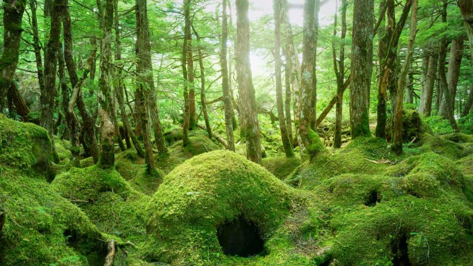 屋久島にある、約424万平方メートルの自然休養林。「太鼓岩」まで行く3~4時間のトレッキングコースの途中には、数百種の苔に覆われた光景が見られる「苔むす森」があり、映画『もののけ姫』のモデルになった場所としても知られています。