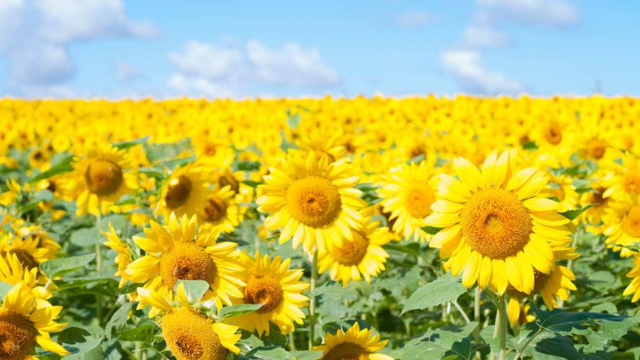 栽培面積約6ヘクタールの丘一面に、春は菜の花、夏は約42万本のひまわりが咲き誇ります。見渡す稜線いっぱいに黄色一色で埋めつくされる景色は実に見事なもの。最盛期に開催される「ひまわりまつり」の会場では、ひまわりの種を利用したひまわりの油、お菓子、ひまわりアイスなどの特産品直売も行われます。