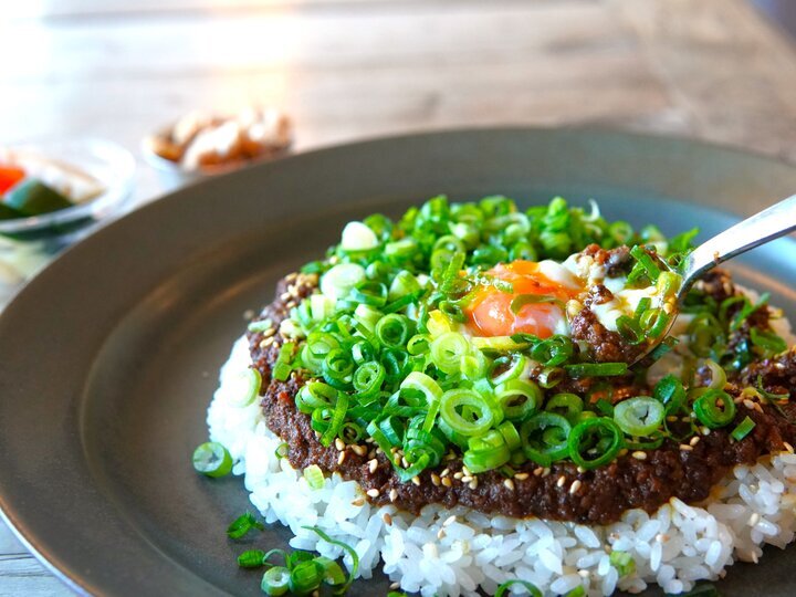 スパイスに八丁味噌とゴボウを加えて煮込む「和風キーマカレー」は、和の要素が加わったやや甘めの味わい。青ねぎの風味と、とろりとした半熟卵の黄身がアクセントになり食欲をそそります。
