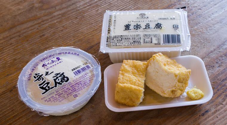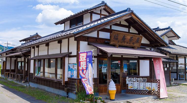 散策のひとやすみにおすすめなのは「福寿茶屋」。地元産を中心に、国産大豆とおいしい水で作った「豊楽豆腐」「寄せ豆腐」を販売。大豆のうまみがぎゅっと凝縮したできたての豆腐は、お土産にも最適です。