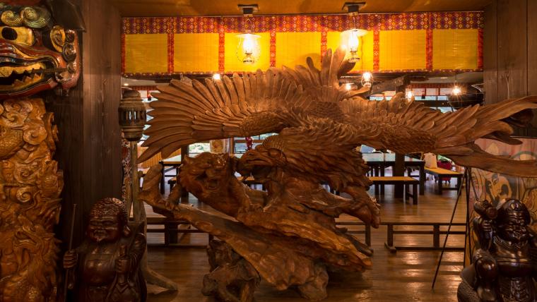 チェックインを終えたら、ロビーラウンジで一息ついてから客室へ。推定樹齢200年と言われる巨大な木彫りのワシの置物が鎮座しています。