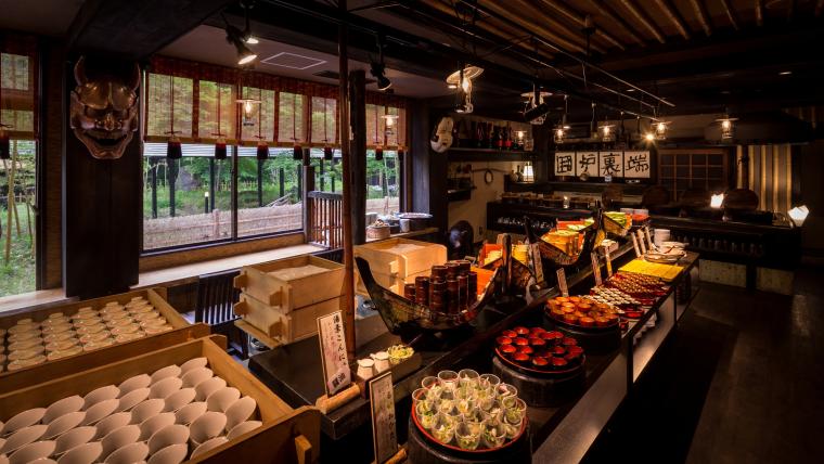 ここで味わえるのは、名物の囲炉裏料理や、「かまど」を使用した秘伝の武家料理、地産の食材をふんだんに使った創作郷土料理のブッフェ。