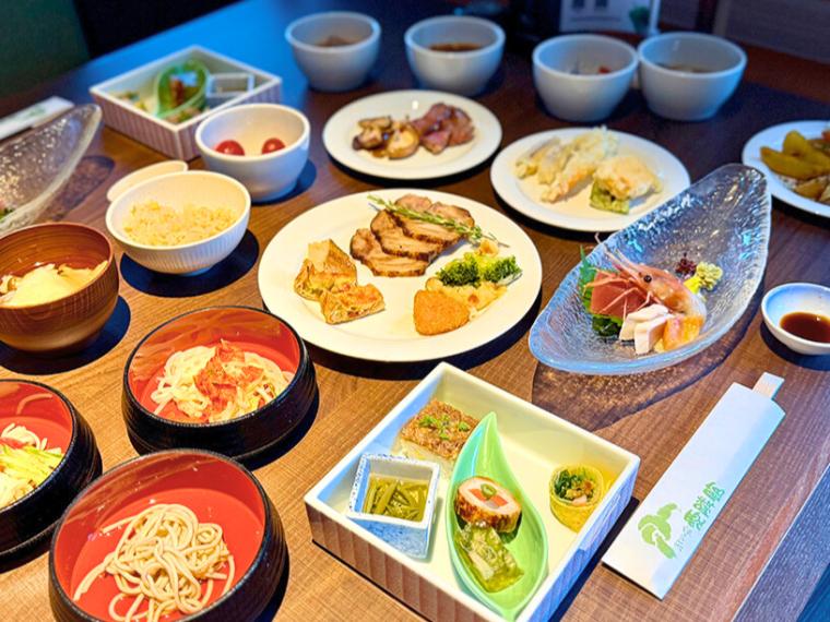 まずご紹介するのは、2023年にリニューアルオープンした「里山ダイニング」でいただくバイキング。個室風の椅子テーブル席でプライベート空間を保ちつつ、地元ならではのグルメを好きなだけ堪能できます。