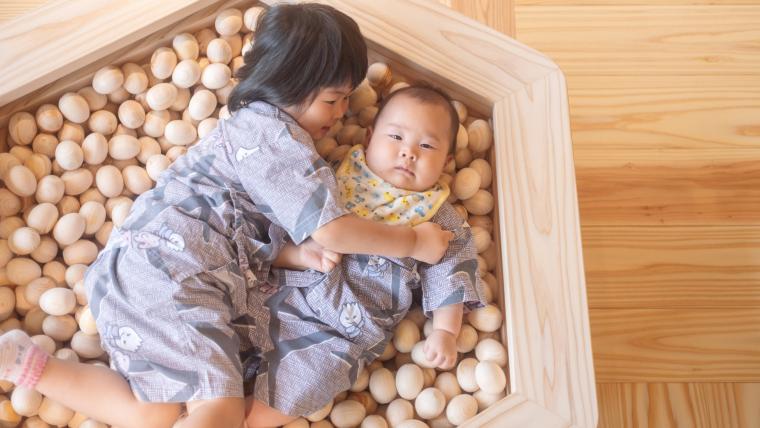室内には、宿オリジナルの遊具「ひっつきむしトンネル」や「木製たまごプール」、さらに、遊びの専門家によって選ばれる「GOOD TOY AWARD」受賞の上質なおもちゃが並び、木のぬくもりに包まれた空間で、のびのびと遊べます。