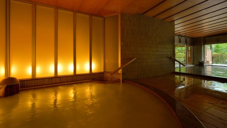 一見ひとつの浴槽に見える内風呂は、実は寝湯・熱湯・ぬる湯などのエリアに分かれています。移り変わる湯加減の中で、その日の気分に合わせた湯浴みを楽しめます。注がれるのは「森の湯」と同じく「新黄金の湯」。やわらかな肌あたりで、湯上がりにはしっとり潤う「美人の湯」と言われています。
