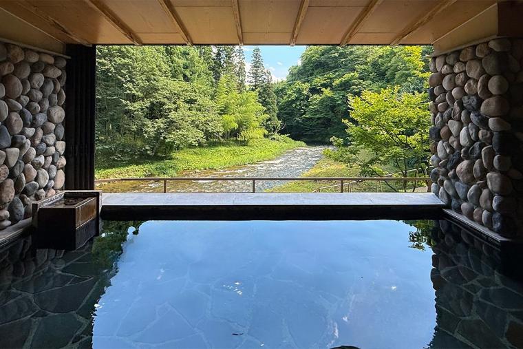 多くのメディアで「絶景温泉」と称される「川の湯」。晴れた日には大きな窓がすべて開放され、目の前に豊沢川のせせらぎと深い緑が広がります。湯に身を沈めれば、まるで自然そのものに抱かれているかのような開放感に包まれます。