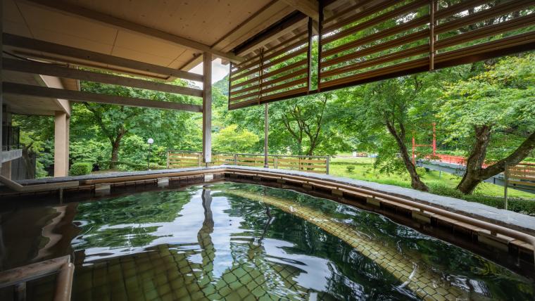 飲泉で温泉の恵みを味わったあとは、いよいよ湯浴みの時間。館内には3つの大浴場があり、「森の湯」と「山の湯」「川の湯」は男女入れ替え制で趣の異なる湯を堪能できます。